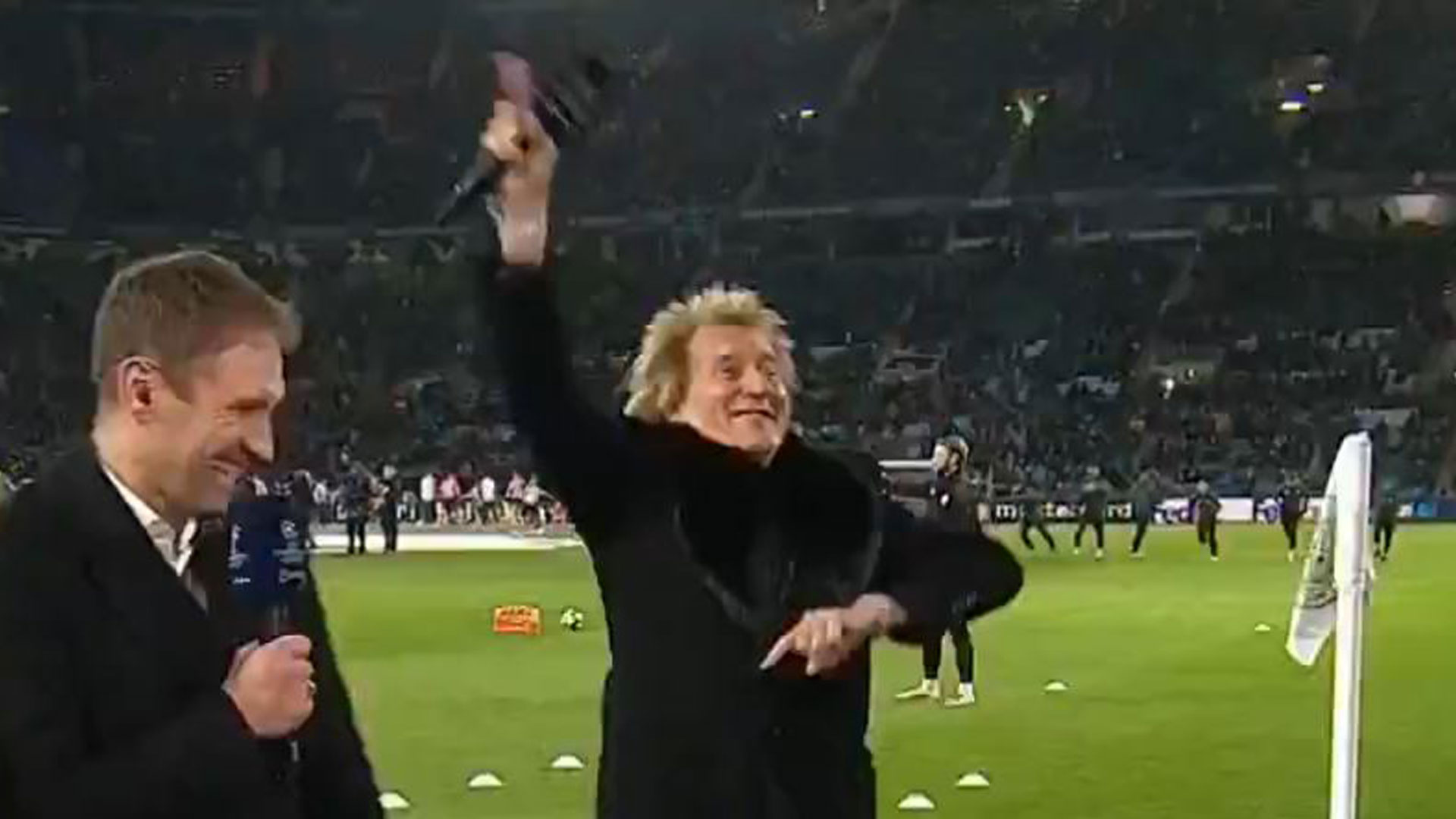 Stewart’s evening at Celtic Park was far from over as TNT Sports caught up with him shortly after the CBS interview. He began by declaring, "I’ve had a couple of drinks as you can probably tell, wahey," setting the tone for another lively conversation. The singer’s love for Celtic was evident as he explained how the club runs through his veins, a sentiment that resonates deeply with many Celtic supporters. In a moment of pure passion, Stewart burst into a lively dance for the crowd, much to the delight of the TNT interviewer and the fans. Initially, it appeared as though he had taken the microphone with him, leading the presenter to exclaim, "He’s taken the mic," but Stewart quickly handed it back to a producer in the background.