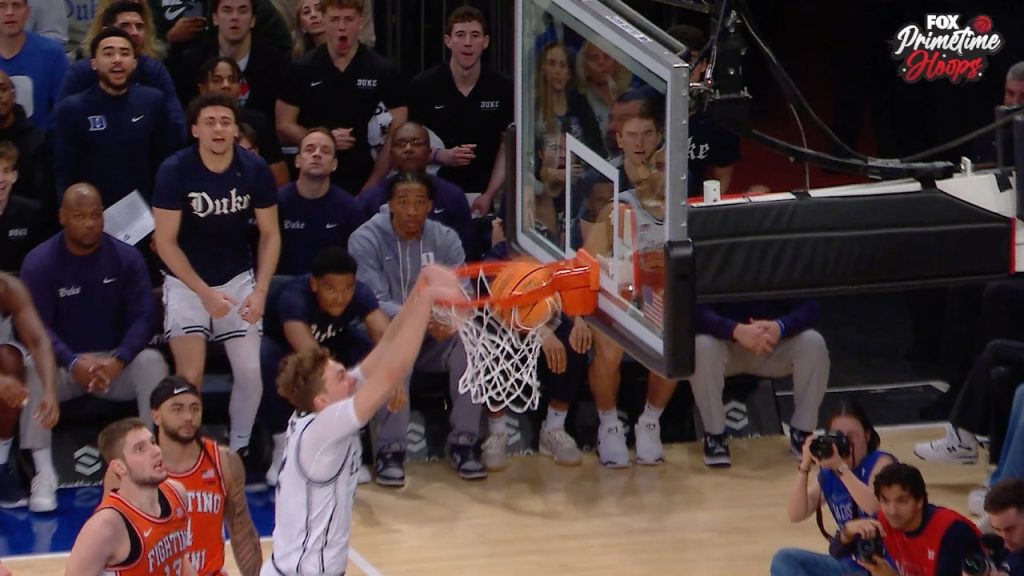 As the ball changed hands and the plays unfolded, the Blue Devils’ offense moved with fluid precision. Flagg received a perfect pass from a teammate and sprinted toward the basket. Illinois’s defense closed in, but Flagg’s speed and agility allowed him to navigate through. In a burst of raw power, he leaped into the air and, with both hands, slammed the ball through the hoop. The crowd erupted in cheers, and the momentum swung even further in Duke’s favor.